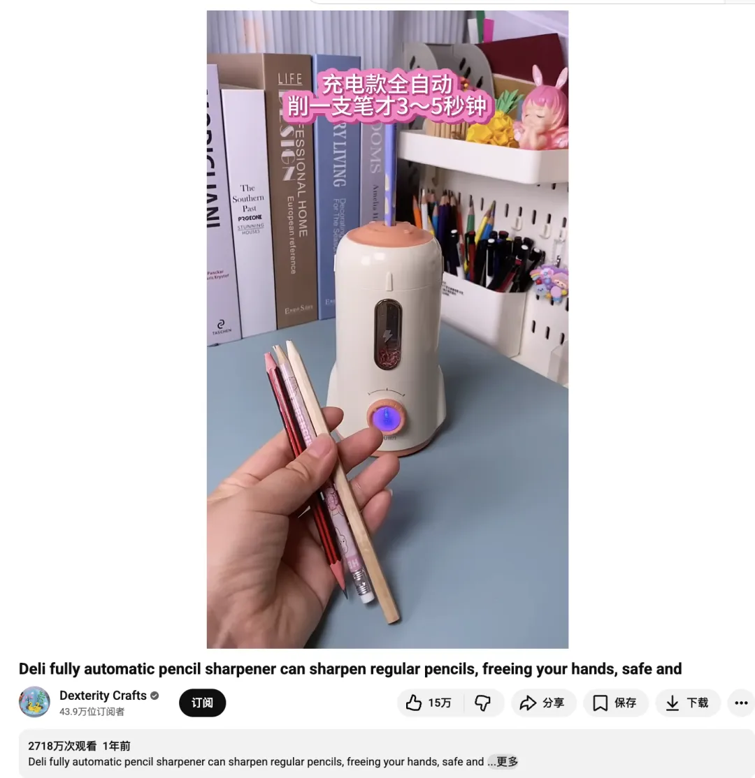 Deli 与 Dexterity Crafts 的合作,最具代表性的案例是全自动削笔机的短视频展示。视频通过近景特写完整呈现插笔、启动、削笔完成的全过程,配合画面文字强调“全自动”“3–5 秒完成”“充电设计”“解放双手”等核心卖点。