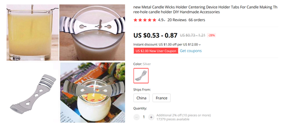 如果卖家朋友上架到网店的产品和蜡烛芯固定器有关,并且产品外观与原告的外观设计图相同或相似,则可能构成侵权,如下面这位卖家: