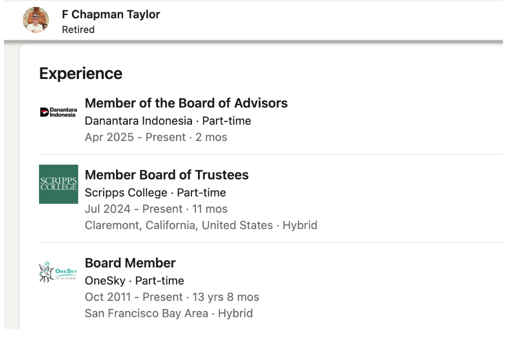 墨腾的很多朋友们也很惊讶达利欧和萨克斯这两位大佬能够愿意来为这个新成立的机构来背书 - 因为一来他们其实在印尼并没有特别的利益和诉求,二来印尼这块的水一直很深。而Chapman Taylor则很高兴地把新的顾问职衔放到了自己的领英页面上:
