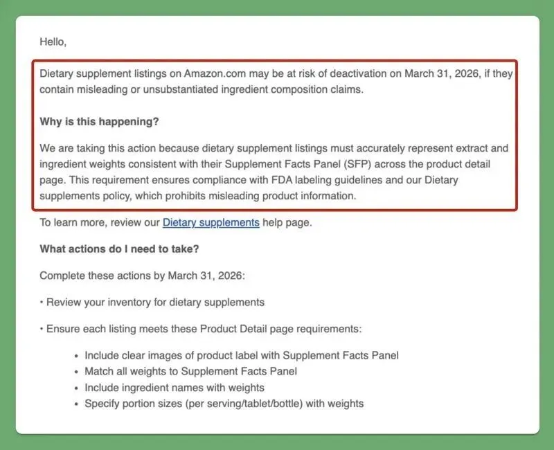 亚马逊后台发布通知,自 2026 年 3 月 31 日起,如果保健品类目产品的商品详情页中的成分描述与包装上的 Supplement Facts Panel(SFP,补充剂成分表)不完全一致,相关 Listing 可能会被直接下架或停用。