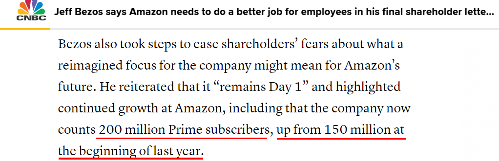 前不久,美国媒体CNBC披露了贝索斯给股东的最后一封年度股东信(姐夫将于今年第三季度辞去CEO,现任AWS CEO安迪·贾西将接替他的职位)。贝佐斯在信中透露,目前亚马逊全球Prime会员数量已突破2亿,而在去年年初这一数字为1.5亿。