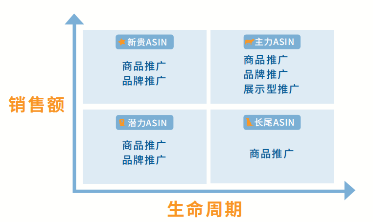 作为已经步入成熟期的单品牌卖家,就需要考虑如何利用广告工具,为品牌下的产品实现分级。那么该如何给产品分级呢?下面的ASIN矩阵就能帮助卖家将所有商品根据销售额和周期分成四类:新贵ASIN、潜力ASIN、主力ASIN、长尾ASIN。