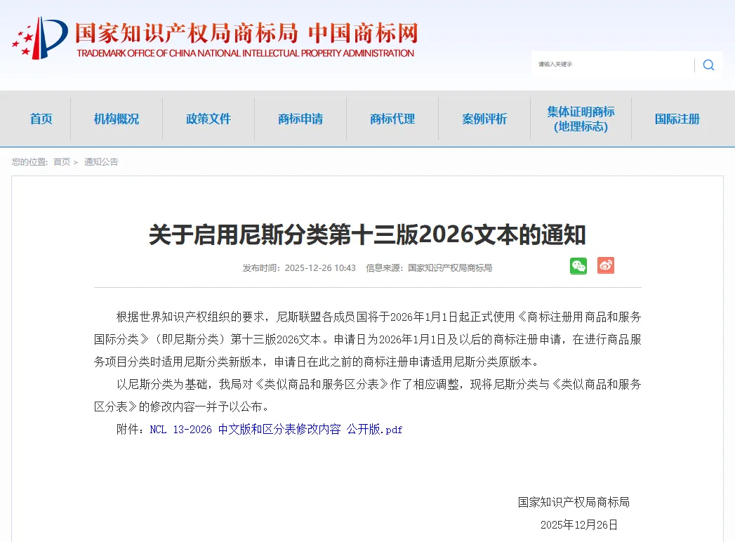 需注意,此次修订不具有追溯效力,已注册商标的权益不受任何影响。但自2026年起提交的所有新商标注册申请,将统一采用《尼斯分类》第十三版(2026版)。