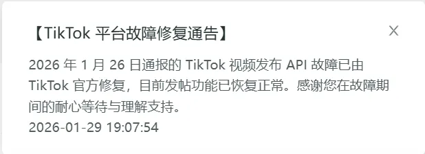 最新进展!TikTok已修复API故障,恢复发帖功能,电商板块运营功能也已逐步恢复,目前各大TikTok相关的数据统计平台均已可正常统计1月25日之后的数据。