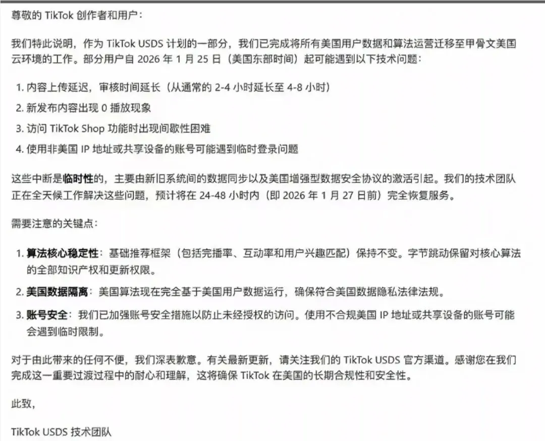 根据TikTok官方给出的解释,此次故障是美国暴雪引发的数据中心断电,同时叠加TikTok美国业务的强制剥离,在数据迁移过程中造成的服务中断。