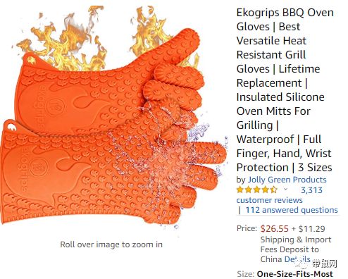 这款烤箱手套评论数超过3300条。好评度高达4.4星。这款产品大受消费者喜爱的原因在于安全的材质:不含BPA等有毒化学物质,而是使用了FDA批准使用的Ekogrips硅胶材质,耐热度高达425度。可以直接烤箱、沸水、或洗碗机等环境下使用。
