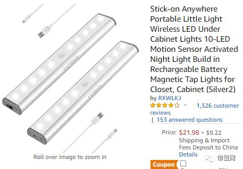 这款4.2星的LED灯条拥有1326条评论,其最大的卖点是可以灵活黏贴在任何表面,此外10英尺内的人体自动感应亮光以及20秒自动关闭的功能也让其十分实用。