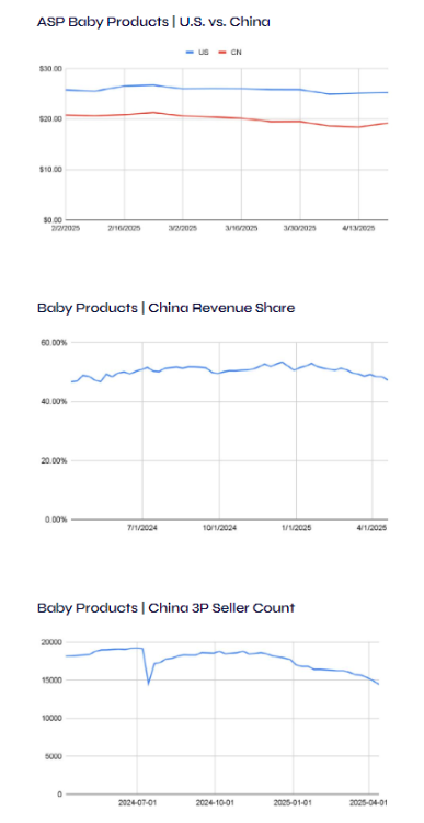 婴儿品类展现出美国与中国卖家在定价策略上的明显分歧。在宣布关税的当周,婴儿产品的平均售价基本保持稳定,没有观察到显著的变动。