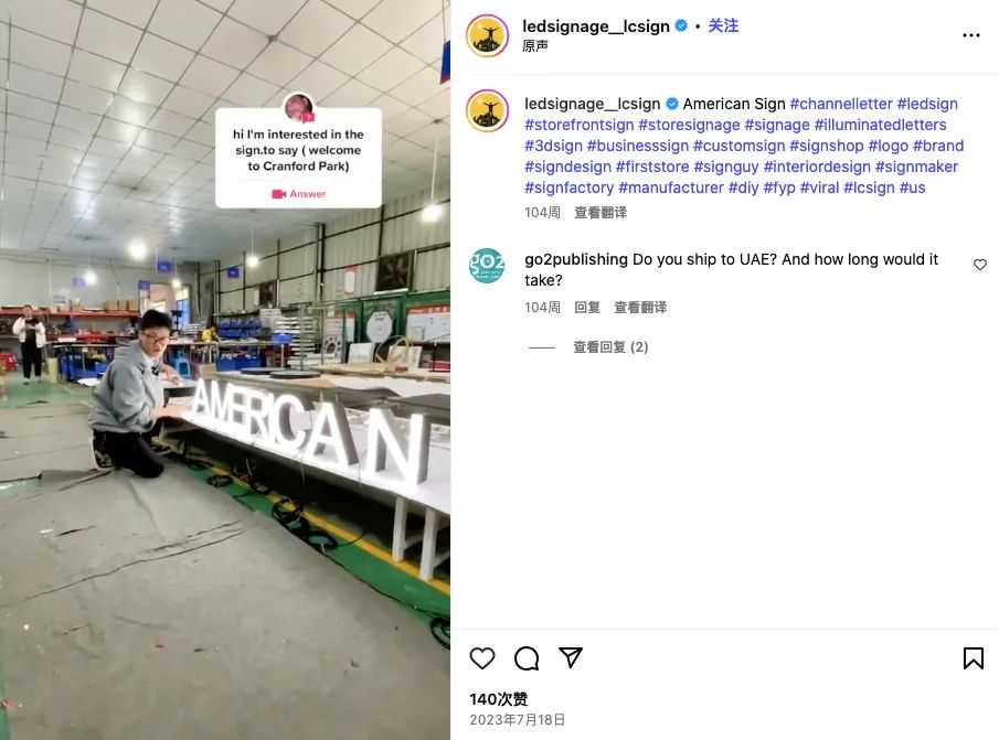 Tony出镜后,LC SIGN的爆款时刻是一次偶然的机会,车间生产出一个 “美国” 字样的灯牌。Tony 灵机一动,在对灯牌的介绍中加入了 “American sign made in China”(中国制造的美国标识)。这条视频一经发布,迅速在平台上引发广泛讨论。