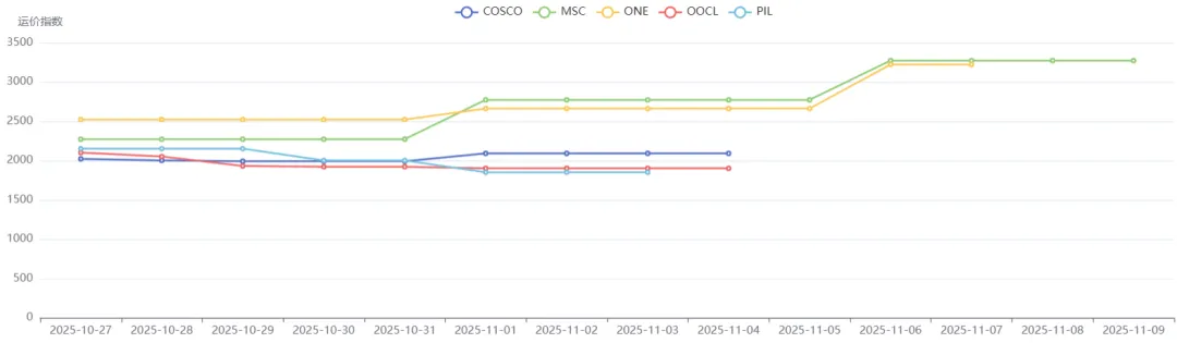 澳新航线即期市场订舱价格保持涨势。10月31日,上海港出口至澳新基本港市场运价(海运及海运附加费)为1493美元/TEU,较上期上涨7.8%。