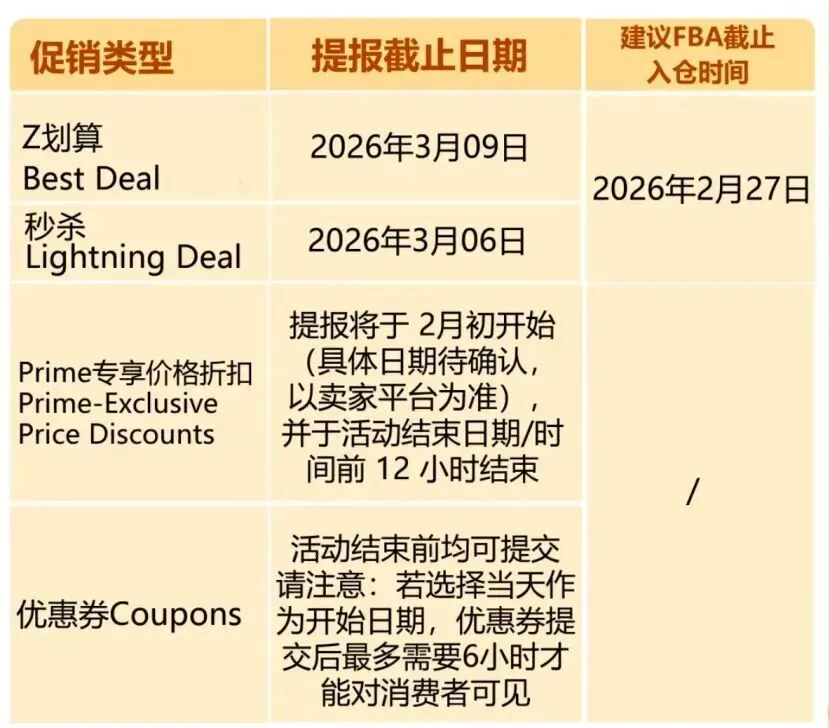 Lightning Deal(秒杀):提报截止 2026年3月6日;建议FBA截止入仓时间同为 2026年2月27日。
