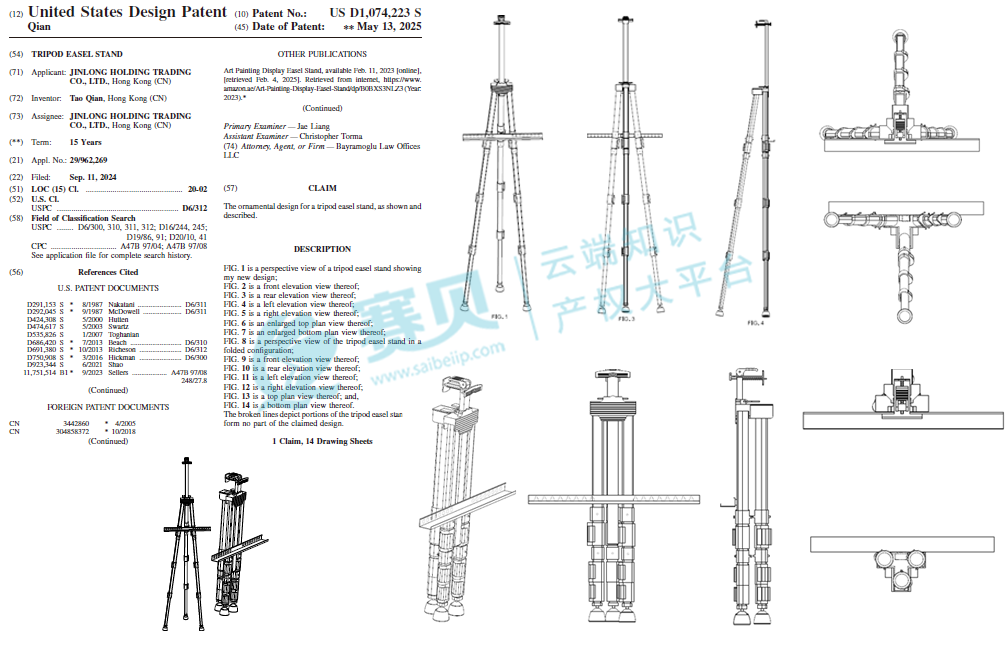 案件涉及三脚架画架(TRIPOD EASEL STAND)的美国外观专利(US D1,074,223 S),2025年5月13日授权,专利保护其展开与折叠状态的外观设计,实线部分受保护,虚线部分不属于保护范围,卖家需规避相关侵权风险。