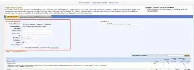第三步:然后你可以选择“ship to address(移除,移到美国本土地址)”或者是“dispose(销毁)”。选择“ship to address”后要输入详细的收货地址,在页面下方可以选择要移除的是“Unfulfillable”还是“Fulfillable”,输入数量,然后点击continue;