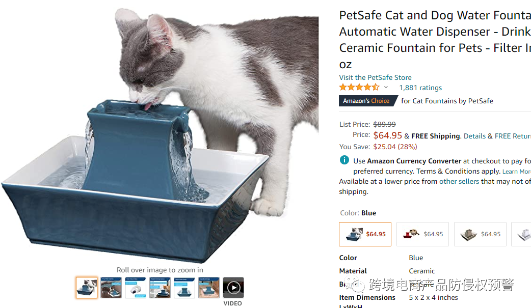 我在亚马逊美国站看到一款宠物饮水机,目前是亚马逊美国站的Amazon's Choice,现有留评数1881,售价在64.95美元: