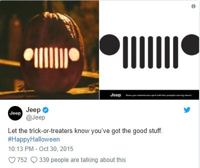 如下图中吉普汽车的例子。吉普汽车的社媒内容选择了非常简单的方式,即在南瓜灯上雕刻品牌的标志,但这无疑是一个省时高效的万圣节内容营销案例。简单的南瓜灯标志不仅吸引了平台用户的目光,同时也让吉普汽车的标志深深被人们所记住。和上文中提及的一样,商家无需将所有产品和万圣节联系起来,但可以发挥创造性思维来展现品牌。