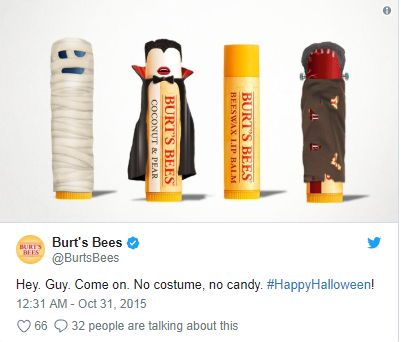 而小蜜蜂(Burt'sBees)唇膏则把自己的热门产品进行万圣节的服饰装扮,十分可爱有趣。