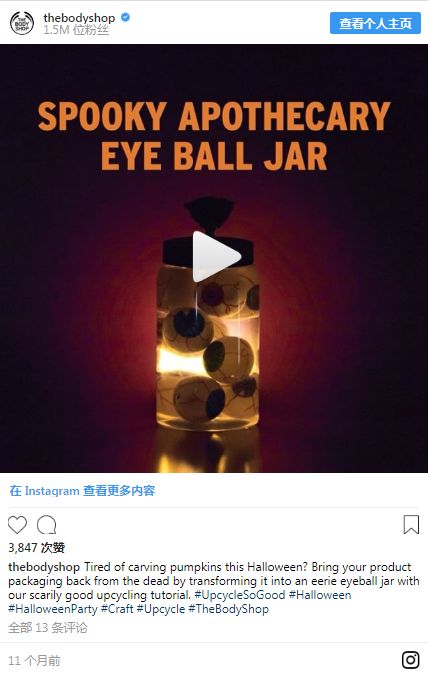 例如The Body Shop就在去年创建了关于把产品空包装DIY成万圣节装饰品的教程,这一可持续使用的环保理念搭配万圣节元素为它们赚足了不少好评。