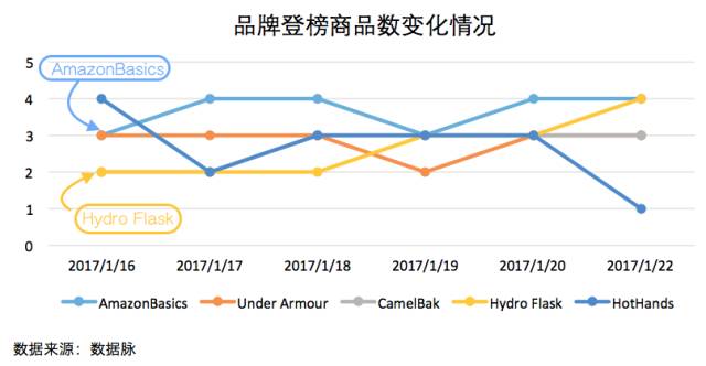 可以看到,在上周的 Best Seller 榜单中,品牌 AmazonBasics 再次以稳定的发挥夺得一周六天中最多的登榜次数22次,位居品牌综合排名首位;品牌 Hydro Flask 则在该周中保持了每日登榜商品数的稳步增长,并于2017年1月22单日登榜4款商品;另外,品牌 HotHands 在该周共有5款商品登榜,为登榜 Best Seller 榜单的品牌中最多的,同样表现出色。