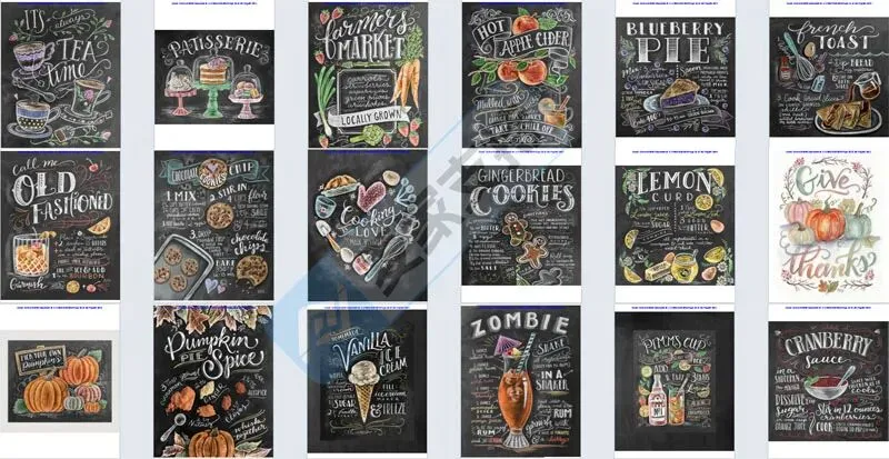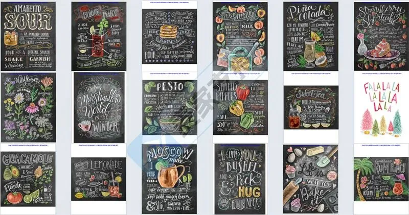 Valerie McKeehan 坚持每一件作品都先在真实的黑板上用粉笔绘制,再进行数字化处理,作品被广泛用于家居装饰、文具、贺卡、婚礼周边及厨房艺术等产品。