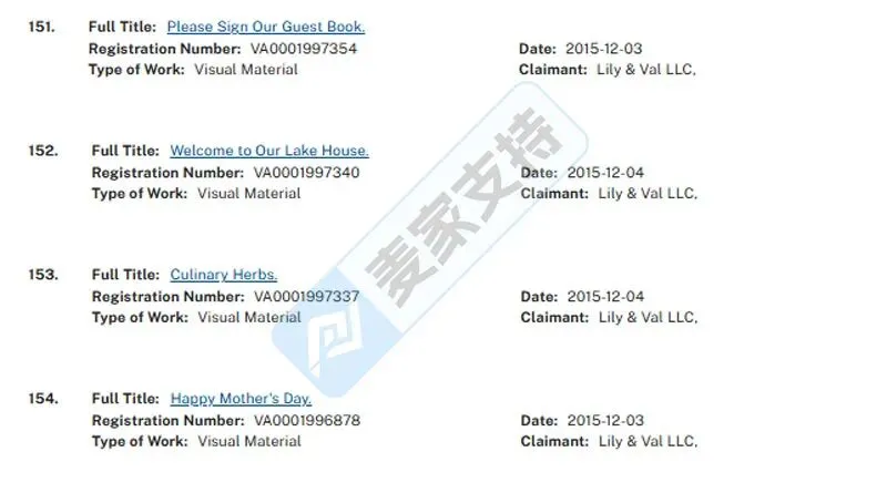 值得注意的是Lily & Val在美国共注册了154个版权作品,覆盖手写体、插画、模板等多类设计,卖家若因放松警惕,极易陷入侵权-冻结-赔偿的恶性循环。需要名单的卖家可联系我们获取并进行全面排查!