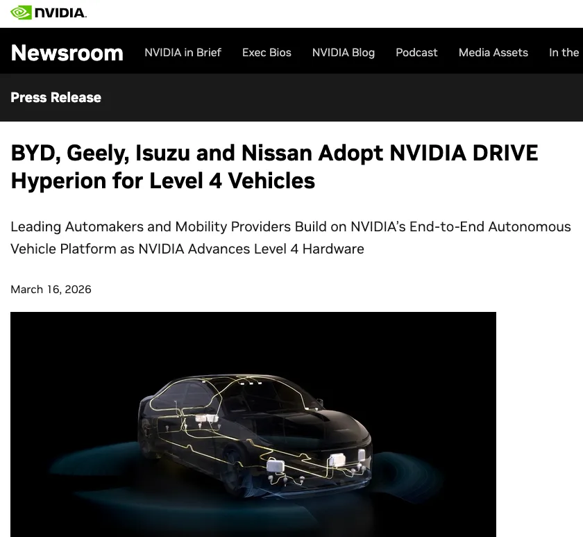 在刚刚结束的 NVIDIA GTC 2026 上,英伟达宣布将与包括比亚迪、吉利汽车在内的四家车企展开合作。在这样一个由全球顶级科技公司主导、代表未来技术方向的合作框架中,中国车企占据了其中两席。