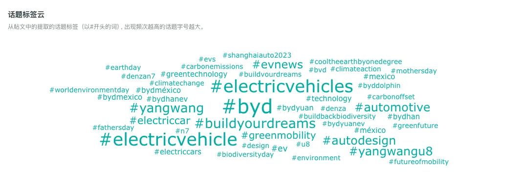 作为新能源汽车品牌,比亚迪在“减排”“绿色出行”等议题上本身就具备天然优势。但在海外传播中,这种优势并没有被处理成抽象的企业责任叙述,而是转化为高频、可复用的内容表达。通过对其Facebook全球页的观察可以看到,#carbonemissions、#greenmobility 等标签已经成为与品牌词并列出现的核心语义单元。这意味着,ESG不再是报告中的信息,而是进入日常内容流中的“默认叙事”。