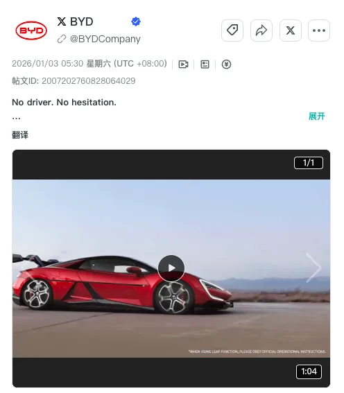 在其高互动内容中,除了车型与技术展示,一个更具代表性的案例,是其围绕仰望 U9 的内容传播——在其社交媒体主页近90天内的热门互动帖文中,“YANGWANG U9 无人驾驶以 74.5 英里/小时的速度自主飞行,腾空 6 米”的内容获得了显著关注。这类内容的重点,并不在于解释具体技术路径,而是通过一个高度视觉化、近乎“突破认知”的瞬间,直接建立用户对未来出行的直观感受。换句话说,它在做的不是“卖车”,而是在用具象化的方式,让用户提前“看到未来”。