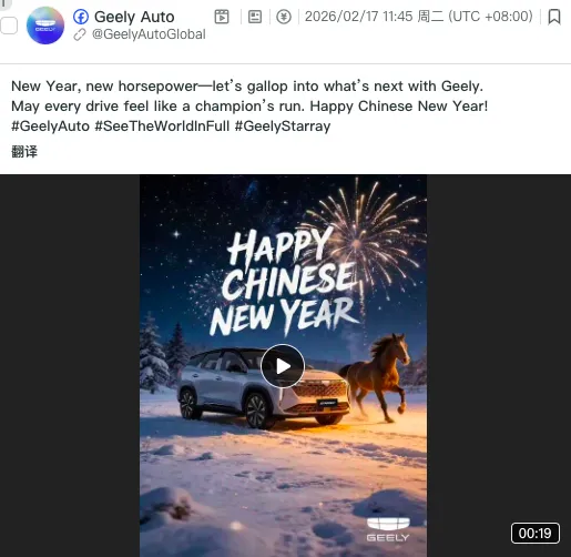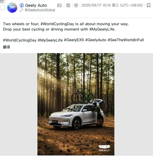 从其海外内容策略来看,吉利并没有执着于持续输出标准化的产品信息,而是选择通过节日与具体生活场景,去构建品牌与用户之间的连接。例如在 Chinese New Year 这样的文化节点,吉利会通过具有东方元素但表达方式国际化的内容,完成文化层面的沟通;而在 World Cycling Day 等全球性节点,则会围绕“车载自行车”“户外探索”等具体使用场景,构建一种更具参与感的生活方式叙事。