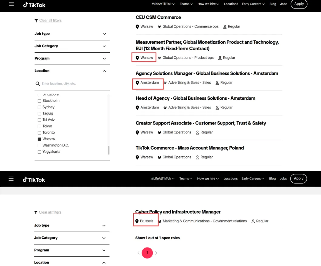 近日,TK观察发现,TikTok平台官网上线多条岗位招聘信息。根据招聘信息显示,官方正面向华沙、阿姆斯特丹、布鲁塞尔三大城市,集中招募客户解决方案经理、TikTok高级用户获取经理、物流运营及解决方案经理等跨境电商全链路运营的关键岗位人才。就各岗位职责描述来看,部分职位显示出明确的地域指向和业务侧重方向。如测量合作伙伴需与指定区域内的领先客户建立合作;物流运营岗位人才需负责波兰本地物流体系管理;全球商业解决方案岗则直接提出要与比荷卢经济联盟地区顶级代理商建立长期战略合作。