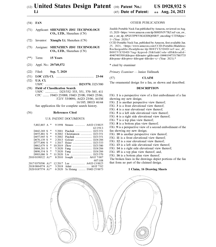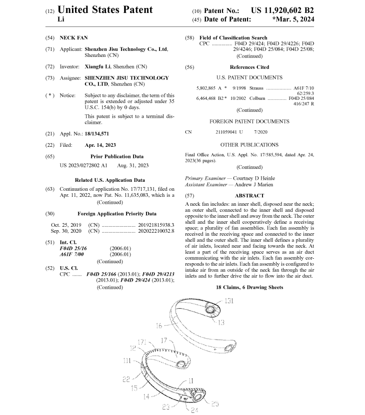 此次维权主要针对挂脖颈扇,涉案专利包括美国外观专利(USD928932S)及发明专利(US 11920602B2),这也就意味着不仅外观高度相似会存在侵权风险,类似原理或结构也会侵权: