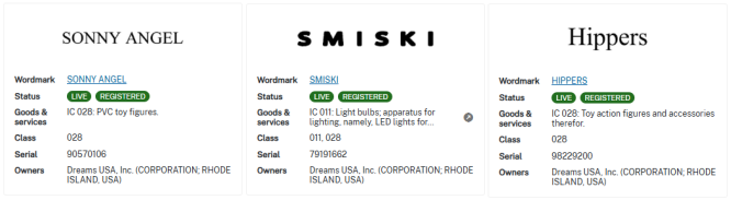 SONNY ANGEL、SMISKI、HIPPERS三个商标注册在28类,有卖相关产品的卖家切勿擅用: