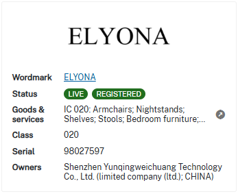 美国商标ELYONA注册在20类,商标号7420879: