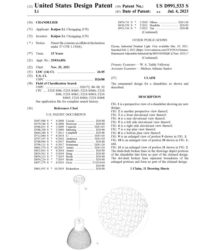 专利侵权涉及名为Chandelier的美国外观专利,专利号USD991533S,2021年11月25日申请,2023年7月4日下证: