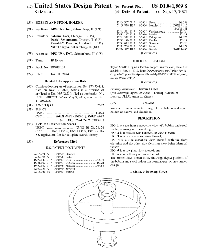 涉及专利名称为Bobbin and spool holder的美国外观专利,专利号USD1041869S,2024年1月11日申请,2024年9月17日下证: