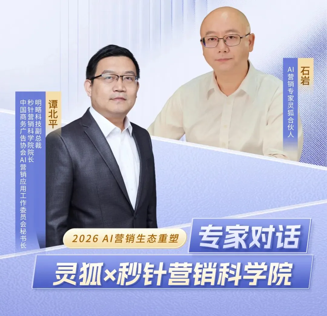 面对AI营销的迅猛发展与行业变革,企业决策者更需以理性、务实的视角重新审视战略方向。本期专家对话,由AI营销专家灵狐合伙人石岩与明略科技副总裁、秒针营销科学院院长、CAAC AI营销应用工作委员会秘书长谭北平深入交流,聚焦2026年AI营销趋势、平台格局变迁、品牌增长逻辑重构,围绕品牌如何系统性布局AI营销战略、如何精准选择适配自身的战略乙方、GEO市场发展等核心议题,展开前瞻探讨。
