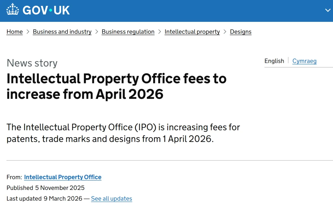 前言:英国知识产权局(UK IPO)已正式宣布,计划从 2026年4月1日起上调商标、专利及设计的官费,这是英国商标官费自1998年(近30年)以来的首次大幅调整,覆盖申请、续展、异议等全流程,平均涨价25%。出海者小编详细解读本轮英国商标涨价。