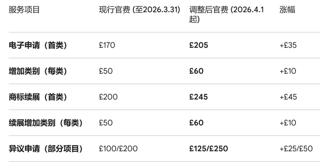英国知识产权局(UKIPO)宣布,2026年4月1日起英国商标官费将平均上涨25%,其中商标申请费(首类)从£170涨至£205(涨幅21%),商标续展费(首类)从£200涨至£245(涨幅23%),每附加类申请/续展费从£50涨至£60(涨幅20%)。