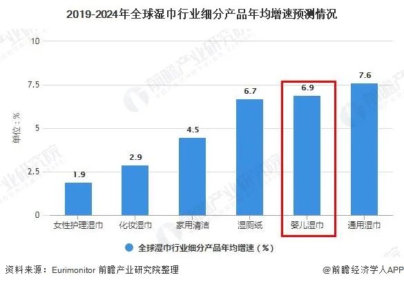 同时,根据Eurimonitor的预测,2019-2024年婴儿湿巾市场依旧能够以加快的增速发展,年均增速将会在6.9%左右,继续坐稳第一大品类的地位。而通用湿巾和湿厕纸年均增速也将会达到6%及以上。女性护理湿巾在未来依旧增速会较慢,约为1.9%。