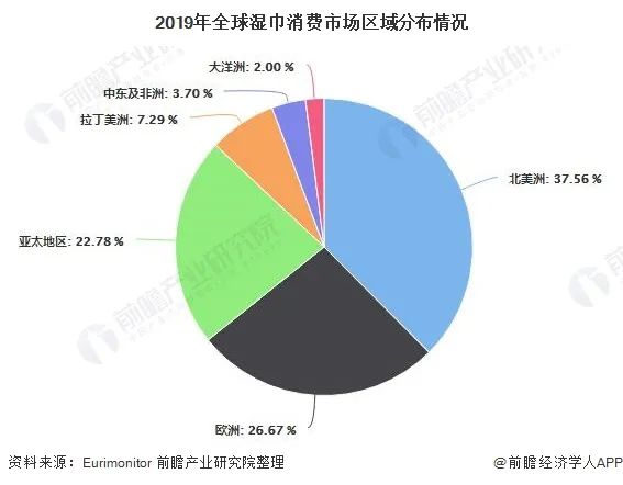 欧美地区的卫生健康意识较早,因此湿巾产品在欧美地区应用普及程度高,欧美地区是全球湿巾的主要消费市场,北美洲和欧洲分别占据了全球湿巾消费市场的37.55%和26.66%。