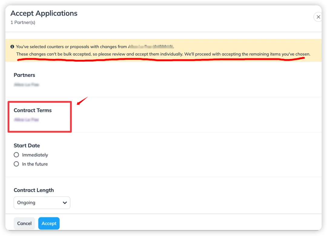 当你点开审核按钮,会出现 Contract Terms 超链接,需要商家单独点开有个页面查看细节(希望 Impact 官方可以看到这个需求,优化审核步骤的产品 UI 交互设计) ,踩坑的基本上就是没仔细看就通过了。