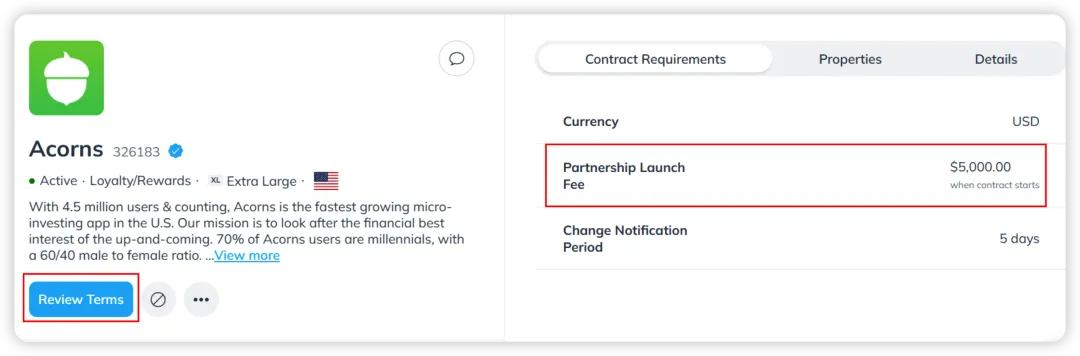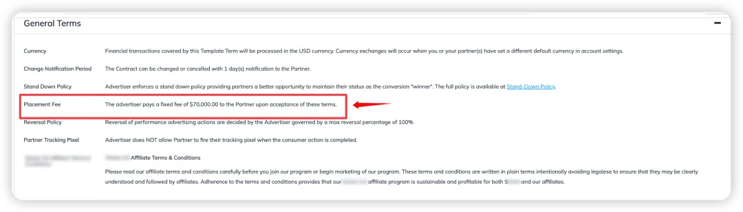 目前联盟营销渠道门槛越来越高,很多头部的联盟媒体都要求有一个 Onboard Fee,Impact 平台其实允许联盟客直接添加在 Terms 里面。
