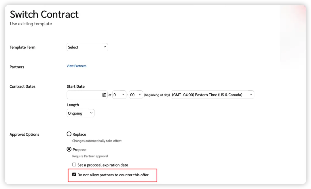进入 Contract - Template Terms 找到需要 Terms,然后在 Switch Terms for all partner 里面选择 existing Partner,将 Approval Options 的 Propose 勾选: