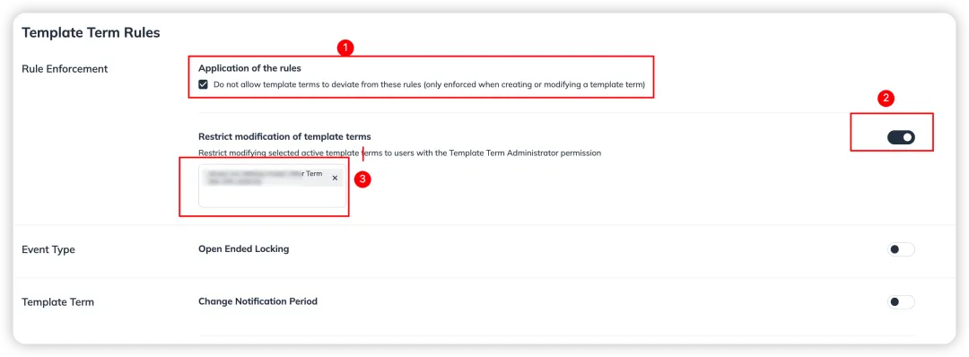 选择你需要限制的 terms。启用此功能确保只有授权团队成员可以修改核心合同模板,同时防止联盟媒体提出超出原条款的变更条件。