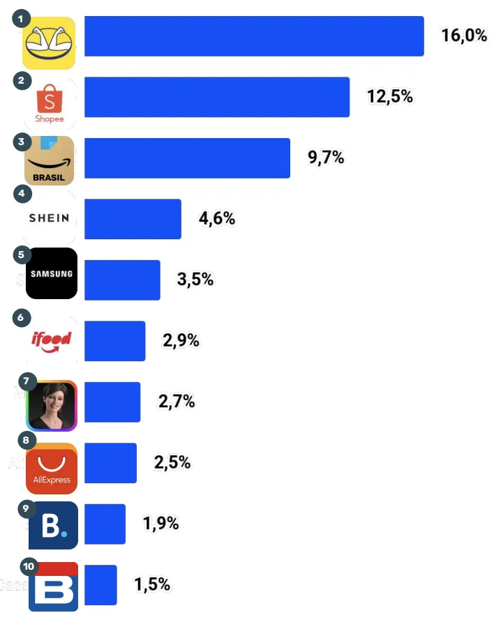 Shopee 通过其丰富的商品种类和灵活的促销手段,精准捕捉了这些节日消费需求。同时,随着Shein 等快时尚平台的迅猛增长(年增长率达到101.3%)以及 Temu 在巴西市场的快速扩张,Shopee 在保持第二地位的同时,也通过优化物流效率和提升用户体验,成功抵御了新进入者的冲击。