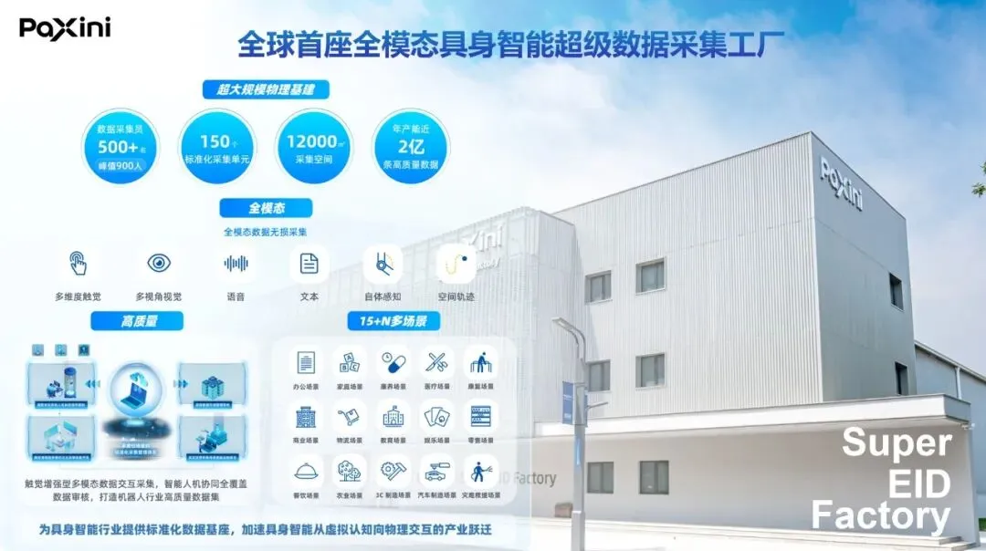 目前,帕西尼已在天津建立全球规模最大的具身智能数据采集与模型训练基地——帕西尼 Super EID Factory。工厂将以约12000平方米的物理基建、15+N 核心场景与150个标准化采集单元,构建年产近2亿条全模态具身智能数据集 OmniSharing DB,并以全球首个具身智能数据云商城的姿态,向全球产业生态开放。据悉,该数据云商城将于近期公开亮相。