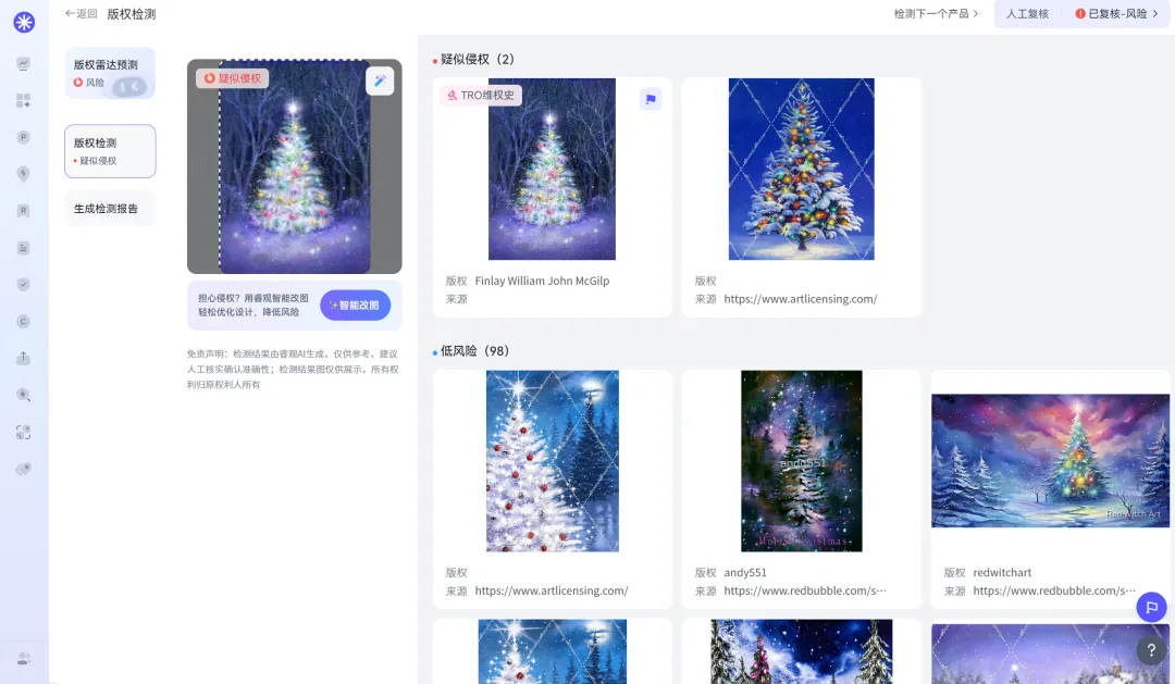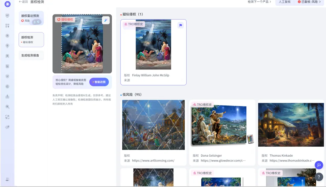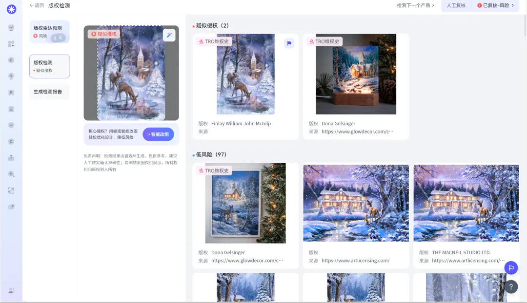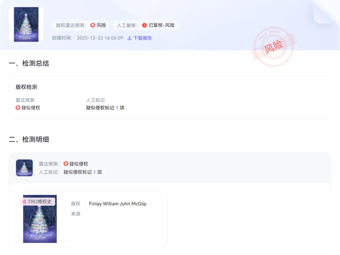 将此次发起维权的图片上传至睿观独家自研的版权检测功能后发现,Finlay奇幻元素插画存在生效版权且已存在TRO维权史。检测结果见下列图片: