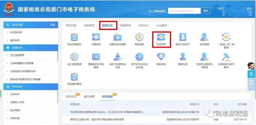 登录厦门市电子税务局,在“我要办税”菜单里选择“证明开具”。