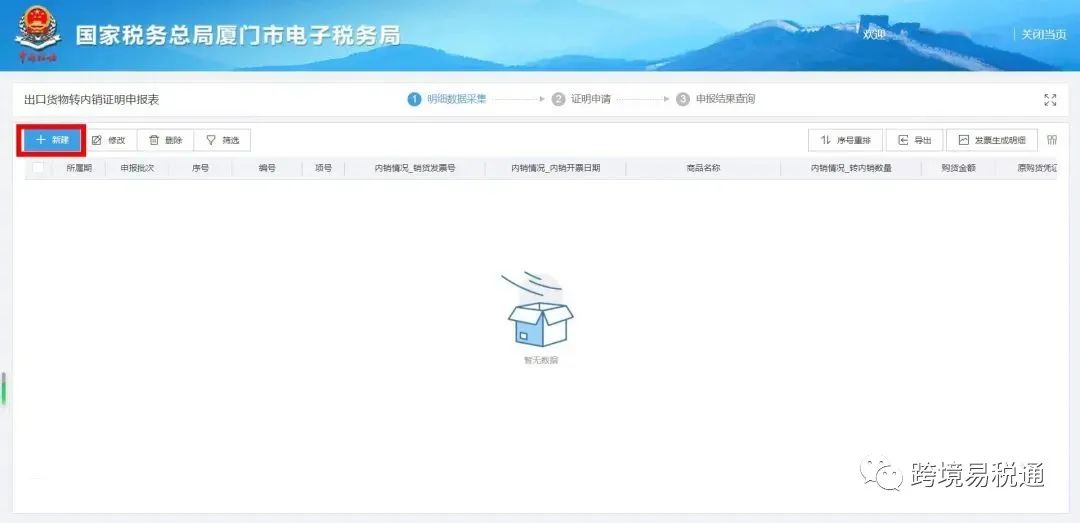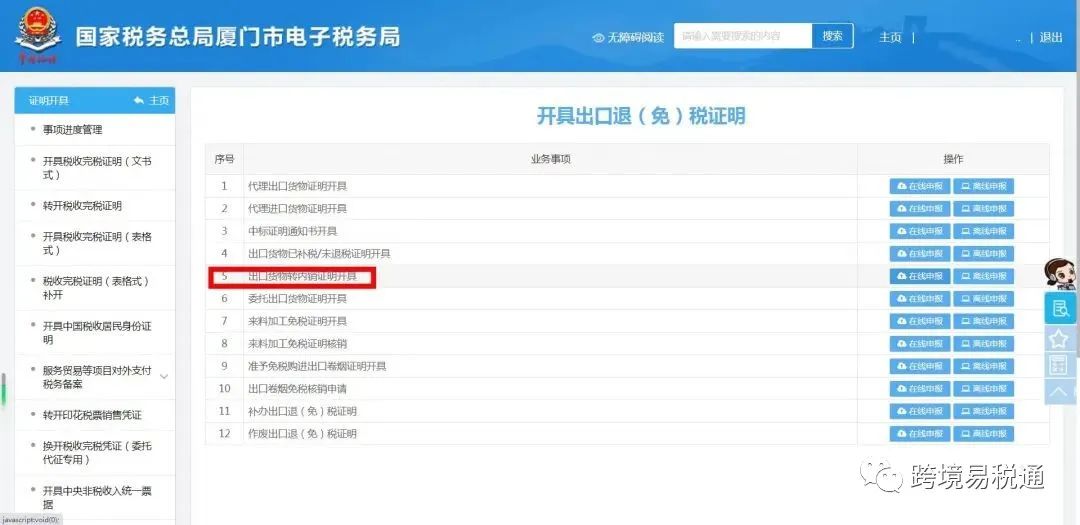 选择“开具出口退(免)税证明”,进入“出口货物转内销证明开具界面”。
