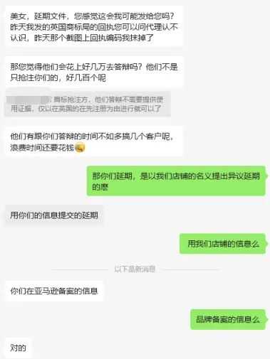 不法份子在与权利人沟通中一再强调所谓的“需要延期申请号和回执才能成功提交英国商标异议”的机制,对被抢注商标权人实施诈骗。同时不负责任地夸大异议成功率高,抢注人抢注的商标众多,且没有实际使用商标,所以肯定不会答辩;且不法分子会不断强调抢注商标成功注册后带来的巨大经济损失,例如客户销售链接会面临投诉下架的风险,可能还会产生高昂和解金等后果。