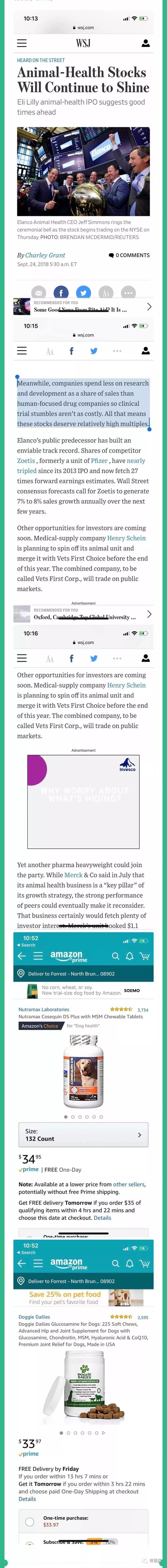 于9月19号上市的Elanco AnimalHealth(NYSE:ELAN),股票第一天就大涨50%。2013年. 上市的Zoetis(NYSE:ZTS),股票已经翻了三翻并且几乎是连续27个forward earnings estimates。另外几家美国医药公司巨头,也都蠢蠢欲动计划将自己旗下宠物健康部门剥离单独上市,其中包括Merck & Co.和Henry Schein。